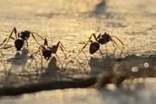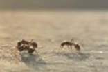 4、工蟻:又稱職蟻。無翅,是不發(fā)育的雌性,一般為群體中最小的個體,但數(shù)量最多。復(fù)眼小,單眼極微小或無。上顎、觸角和三對足都很發(fā)達(dá),善于步行奔走。工蟻沒有生殖能力。工蟻的主要職責(zé)是建造和擴(kuò)大巢穴、采集食物、飼喂幼蟲及蟻后等。為了冬眠,螞蟻們要在秋天吃大量的食物來儲存體內(nèi)的脂肪,而在接下來的整個冬天它們是不進(jìn)食的。正因為如此,蟻群中的工蟻們幾乎每天都在尋找食物,以保證蟻群中的每個成員都能吃到足夠的食物來抵御冬季的寒冷。有些種類有生殖能力,如雙針棱胸切葉蟻,以及部分猛蟻。